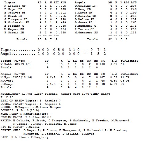 Pitcher of the Day: Vern Ruhle allowed one run on five hits in his complete-game 9-1 win over the California Angels.